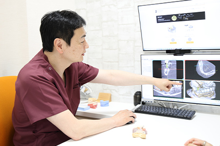 精密なインプラント手術を実現するため、オペ用特診室や歯科用CTなどの先進的な設備を整えています。これらの設備を使用して検査や手術を行い、より精密で安全なインプラント治療を提供できるよう努めています。患者様にとって、できるだけ負担を軽減するための環境を整えております。