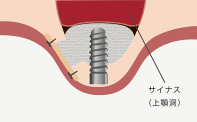 上顎の歯ぐきを切開して顎の一部を押し上げ、その下に人工骨を入れて骨を補充する治療です。上顎の骨の量や厚みが不足している場合、または極端に骨が少ない場合に行います。